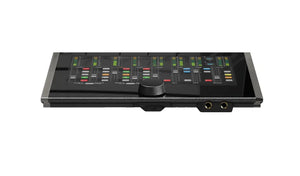 A 10-inch multi-touch LCD screen offers real-time responsive control with virtual faders, touch-sensitivebuttons, and easy-to-read 15-segment metering. Key features like -20dB pad, phantom power, polaritycontrol, and direct monitoring are right at your fingertips. The Alt button lets you switch between studiomonitors and consumer speakers, while a dim button quickly reduces output by -20dB.