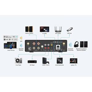 • Play as you like with AirPlay 2, Works with AlexaSpotify ConnectTidal ConnectWiFi 2.4/5G and Bluetooth 5.2 aptX HD.