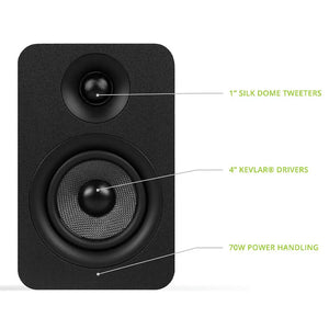 - 4-inch Kevlar woofers – deliver punchy, accurate mids and lows
