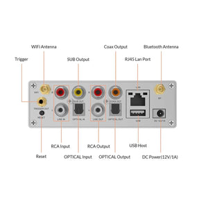 Stereo RCA Line In, Optical In, USB Host, RJ45 Lan Port (Ethernet), Stereo RCA Line Out, Optical Out, Coax Output, 12V Trigger Out, Speaker Out (4-Wire Phoenix connector included), Sub Out, WiFi and Bluetooth 5.0 with AptX HD Support.