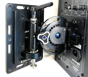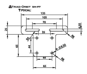 SM-FP Focal speaker plate is “T” shaped to allow the SM-SW1 to avoid the speaker’s I/O, switches and knobs. It has 2, slots for Focal two hole speakers that range from 35mm to 105mm. It also has 4, SM-SW1 M8 holes. This allows both vertical and horizontal orientation when attaching to the SM-SW1 swivel.