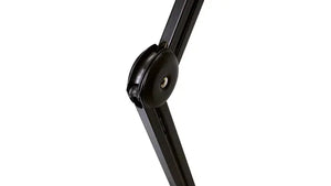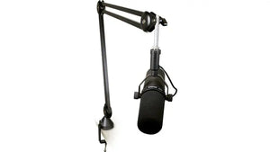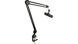 The BCM-200 Broadcast Mic stand is a scissor style design that offers more reach than the competition - offering a max height of 39” when fully extended. The flexible, scissor style tension mechanism allows the BCM-200 to continuously reposition, offering fluid motion in dynamic environments. The extended drop features a 3.2” length - this gives side connecting mics like the SM7B more positioning options, and adds utility for other models. The non-destructive deluxe mounting system includes a round base that allows easy rotation, and a flexible clamp sys tem which also can be used as a utility hanger.