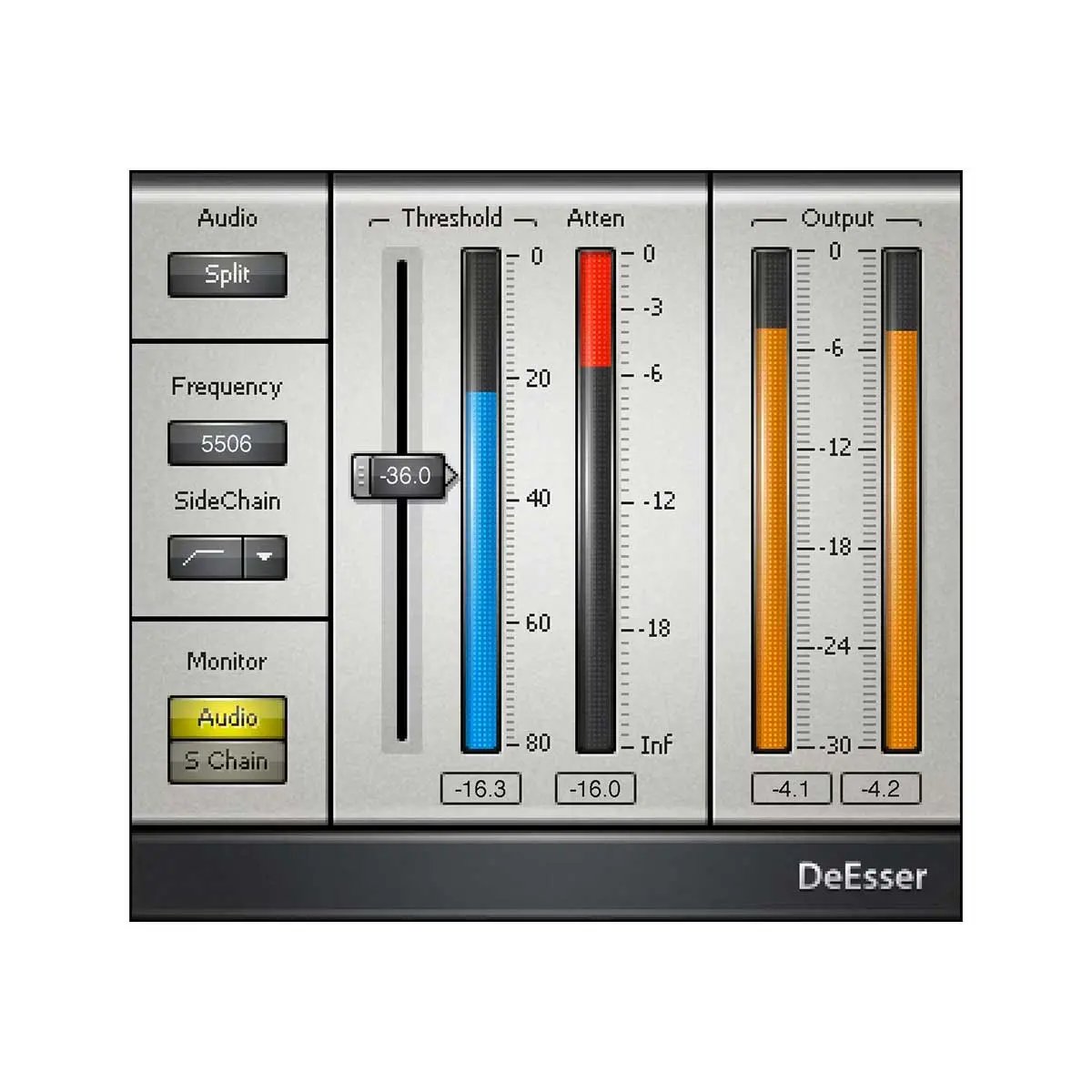 DeEsser uses a hard-knee compressor, so after choosing the frequencies you want to minimize, simply adjust the Threshold for the desired amount of suppression—as confirmed by the Attenuation meter.