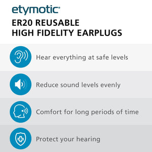 lange tips, these earplugs create an exceptional seal in the ear canal with three points of contact. This design ensures maximum noise reduction and superior sound fidelity compared to single dome silicone tips. The ER20 earplugs use a proprietary tuned resonator and acoustic resistor to replicate the natural response of the ear canal. This technology allows sounds to be reproduced unchanged, just quieter, ensuring that most noise is reduced to safe levels while preserving the clarity and richness of speech and music. Unlike traditional foam earplugs, which can muffle sound and reduce mid-range and high frequencies, the ER20 earplugs evenly reduce noise levels. This preserves the clarity of speech, communication, and music, making them ideal for various settings where maintaining sound quality is essential.