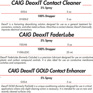 CAIG DeoxIT® is a fast-acting deoxidizing contact treatment solution designed for use as a general treatment for connectors, contacts, and other metal surfaces. DeoxIT chemically improves, rejuvenates, and protects electrical connections for cleaner audio.