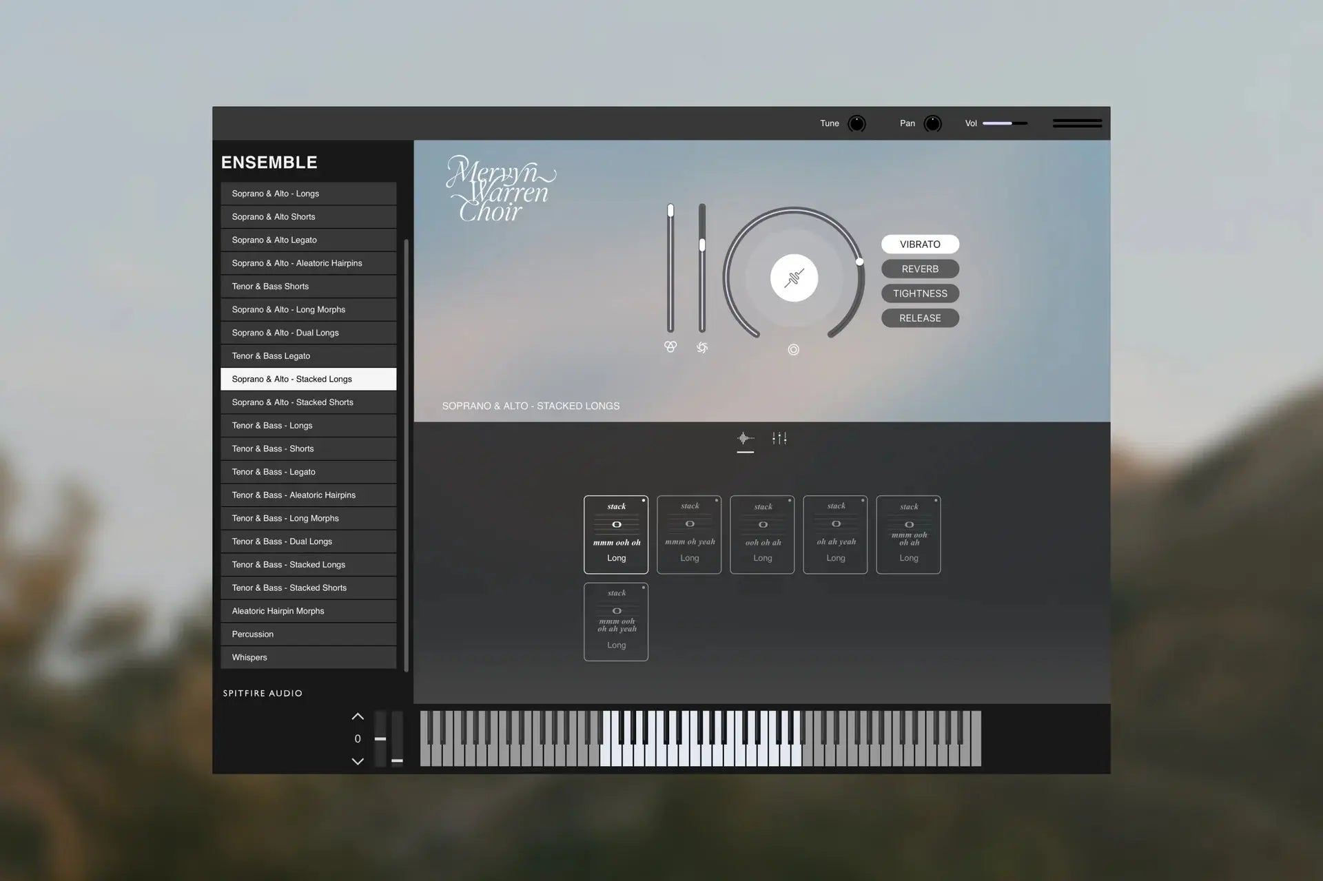 Includes a wide range of vocal sounds, with presets for techniques such as Longs, Yeahs, Oh Long, Ooh Short Staccato, and Mmm Long.