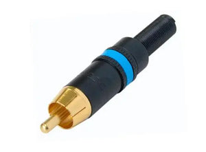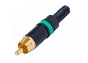 Phono plug, black shell, gold plated contacts, rubber boot for best antikink protection, chuck type strain relief for cable O.D. 3.5 to 6.1 mm, color coding ring